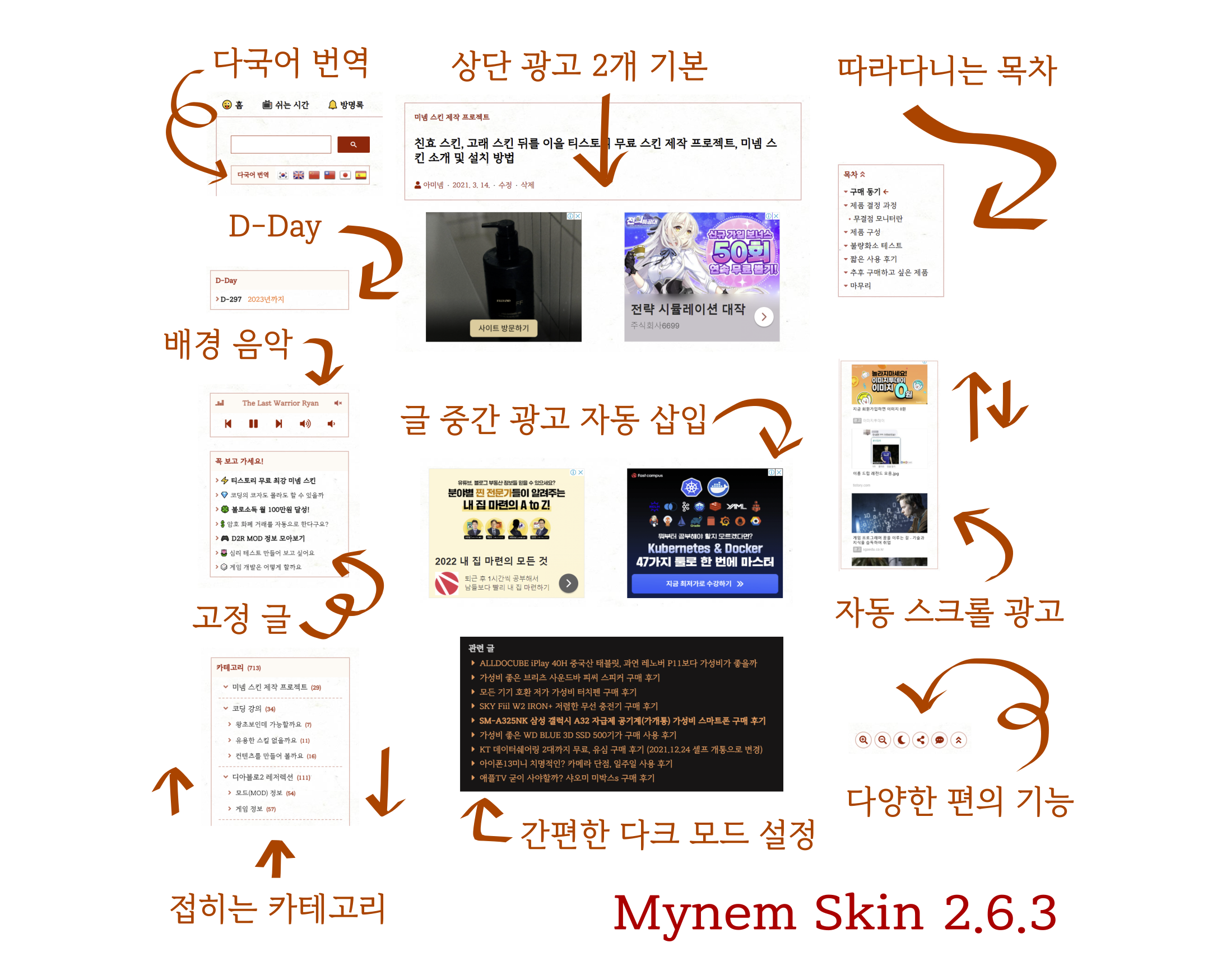 미넴 스킨 게시물에 대부분 설명이 나와 있지만 내용이 많아서 찾기 어렵거나 빨리 훑어 보고 싶으신 분들을 위해 작성하였습니다. 지속적으로 추가해 나가도록 하겠습니다. 목차 사이드바 기