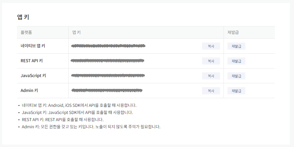 앱설정 > 앱 키 에서 플랫폼별 키를 알 수 있습니다.