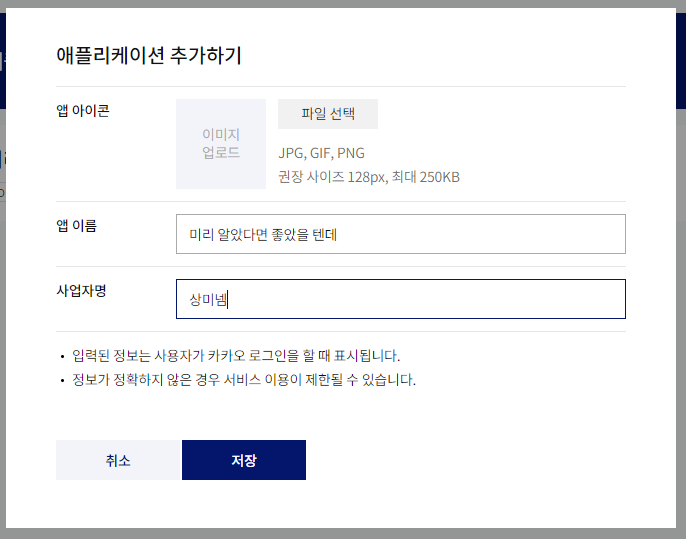 앱 이름과 사업자명을 적당히 적습니다.