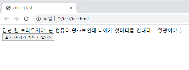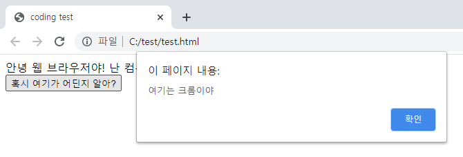 그렇죠 버튼을 클릭하면 '여기는 크롬이야' 라고 알림 창을 띄우기로 했습니다.