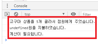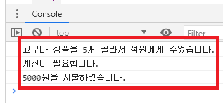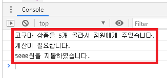console.log(item + " 상품을 " + quantity + "개 골라서 점원에게 주었습니다.");