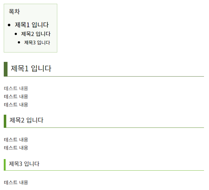 글을 작성하면 서식을 삽입한 부분에 목차가 정상적으로 생성되는 것을 볼 수 있습니다.