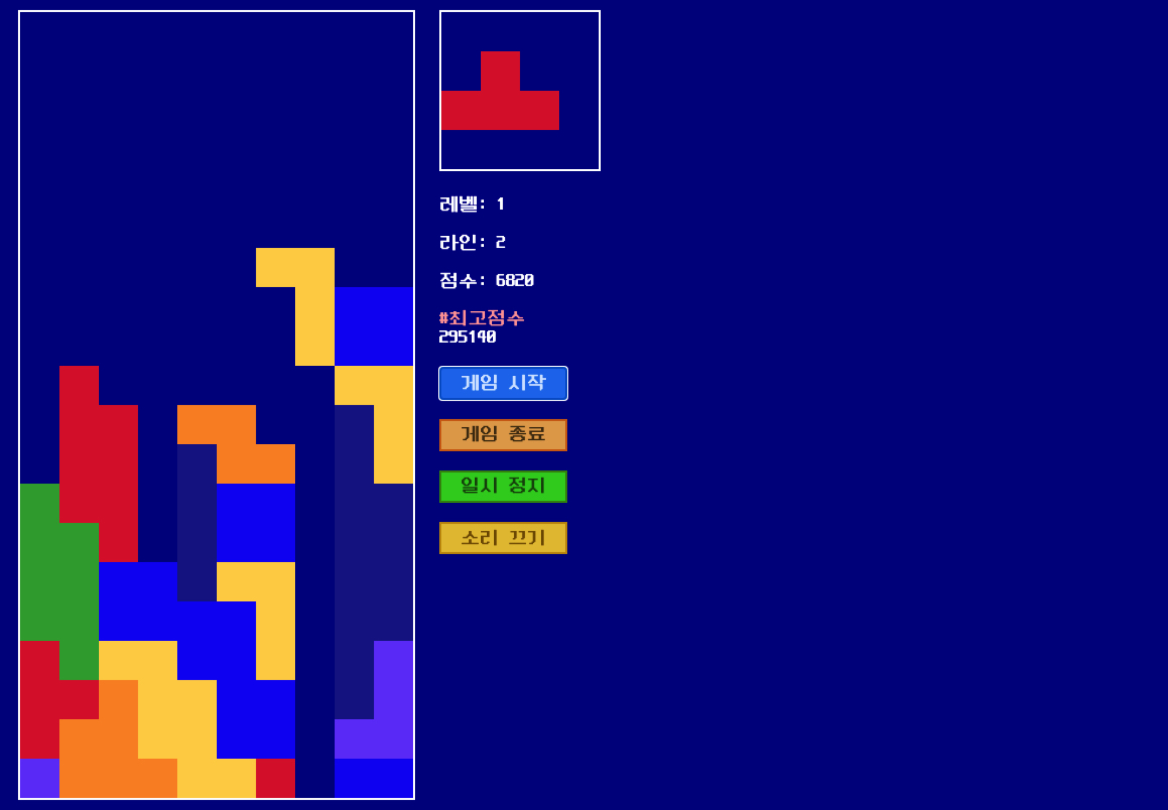 목차 지난 강의 리뷰 테트리스 게임 개발 #7 - 최고 점수 표시, 블럭 색깔 추가, 배경음악 및 효과음 적용 테트리스 게임 개발 #7 - 최고 점수 표시, 블럭 색깔 추가, 배경음악 및 효과음 적용 목차
