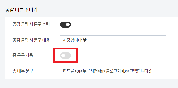 종, 공감 클릭 시 문구 출력 사용 여부 설정