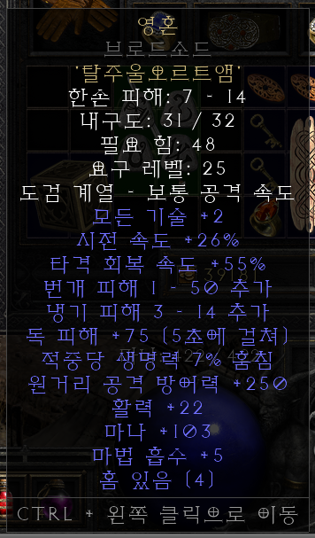참고로 시전 속도는 25~35%, 마나는 89~112, 마법 흡수는 3~8 랜덤으로 붙고 나머지는 고정입니다.