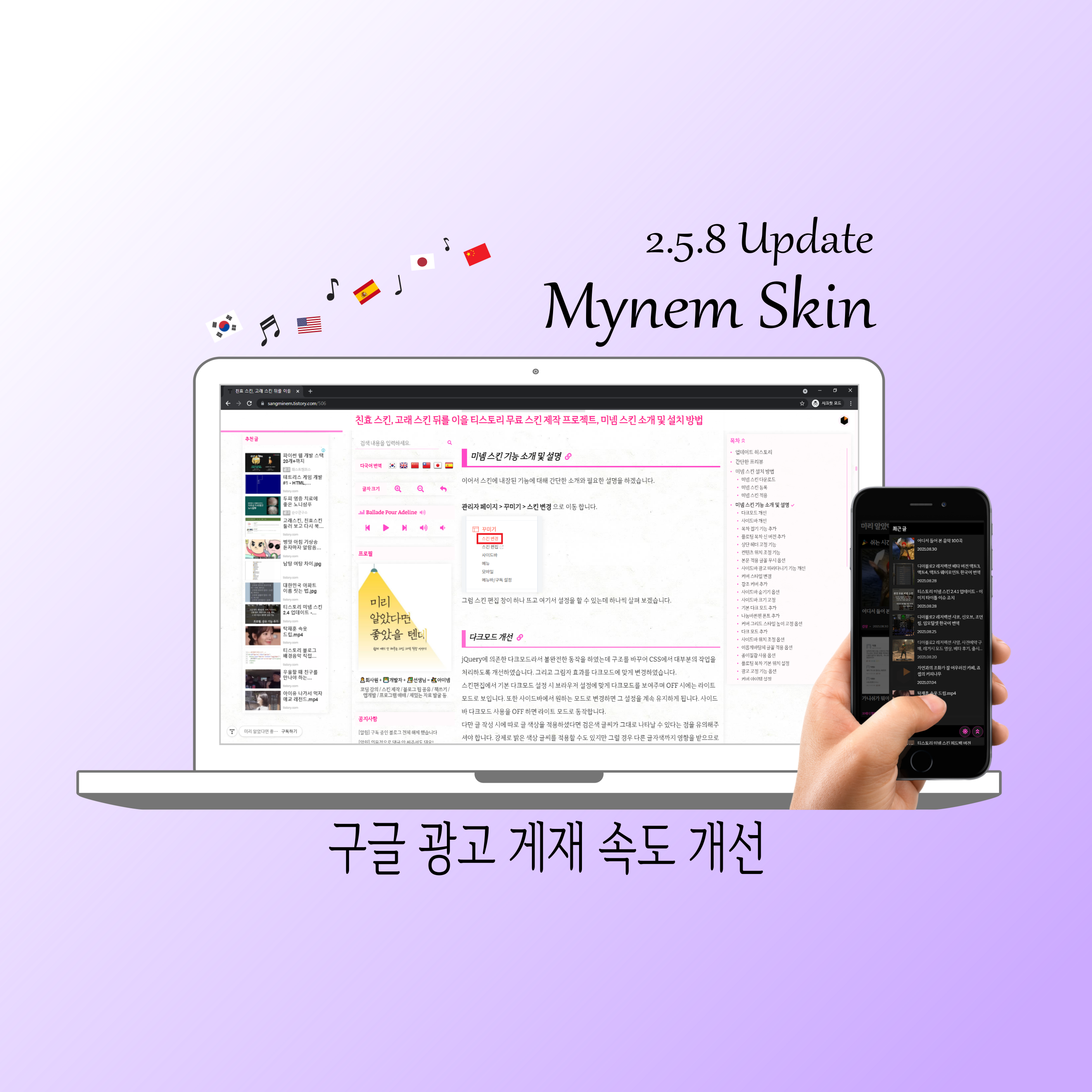 | 티스토리 미넴 스킨 2.5.7 업데이트 - 구글 광고 게재, 배경음악 기능 개선 (20) | 2021.09.23 |