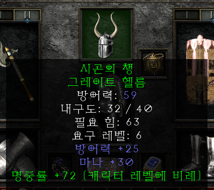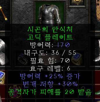 디아블로2를 하면서 초반 깡패 세트 시곤 풀셋을 한 세트 구비해 놓으면 여러모로 좋습니다. 렙제가 6이라서 힘만 된다면 레벨 6부터 착용할 수 있는데 반해 그 옵션은 매우 화려합니다.