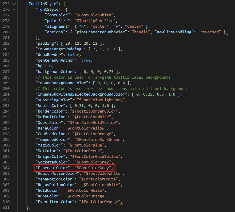 _profilehd.json 파일을 열어서 내용을 살펴 보니 275 라인부터 툴팁 스타일이 정의되어 있었고 304 라인에 EtherealColor라는 키와 $FontColorGrey라는 밸류가 정의되어 있는 것을 확인했습니다. 이 부분에서 색상을 변경해 주면 될 것 같네요.