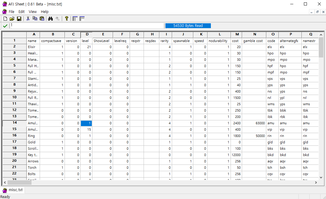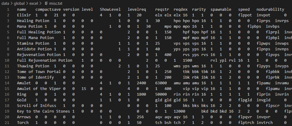 Visual Studio Code 프로그램으로 data\global\excel\misc.txt 파일을 열어보면 데이터가 무엇을 의미하는지 정확히 알아보기는 매우 어렵습니다. 엑셀로 열면 잘 보이지만 편집 후 저장을 하게 되면 문제가 발생한다고 하네요.