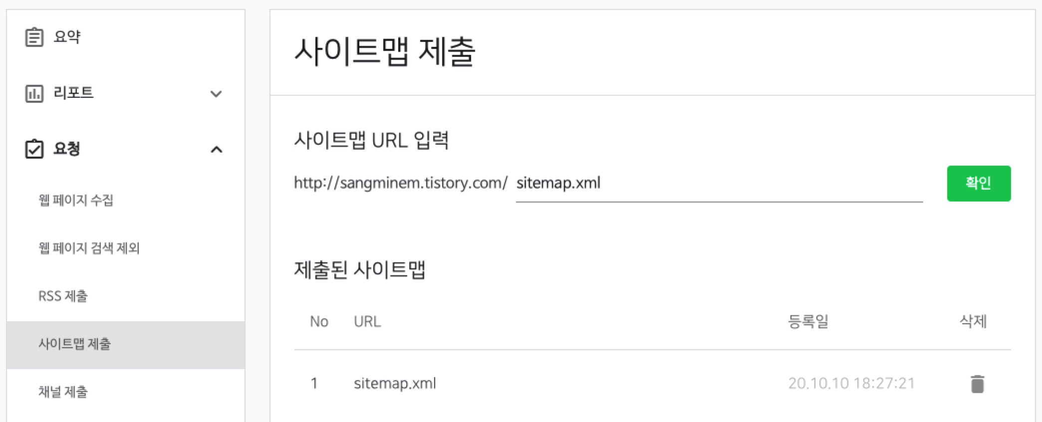 사이트맵 URL은 '본인계정.tistory.com/sitemap.xml' 입니다.