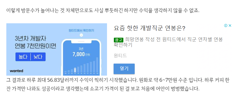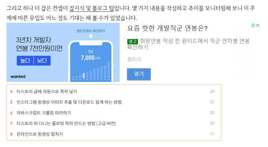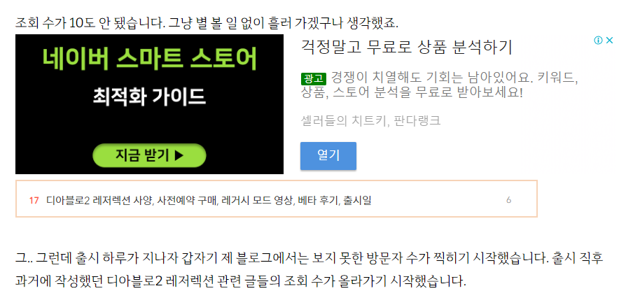 글을 쭉 내리다 보니 광고가 하나 보입니다. 위치가 아주 적절해 보이지는 않지만 목적은 달성을 한 것 같습니다.