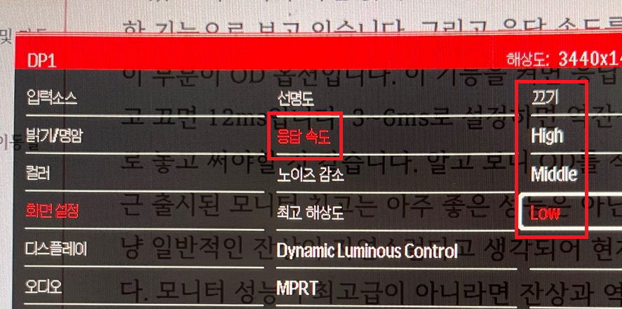 제가 구매한 제품은 VA 패널인데 MPRT 기능을 켜면 응답 속도가 1ms라는데 뭔지도 잘 모르겠고 켜보니까 화면 밝기도 너무 어두워지고 약간 고주파음도 나는 것 같아서 거의 무의미한 기능으로 보고 있습니다. 그리고 응답 속도를 high/middle/low 3단계로 조절할 수 있는데 이 부분이 OD 옵션입니다.