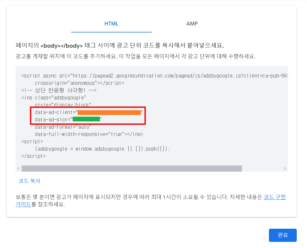 이어 나오는 화면에서 다음과 같은 광고 코드를 확인할 수 있습니다.