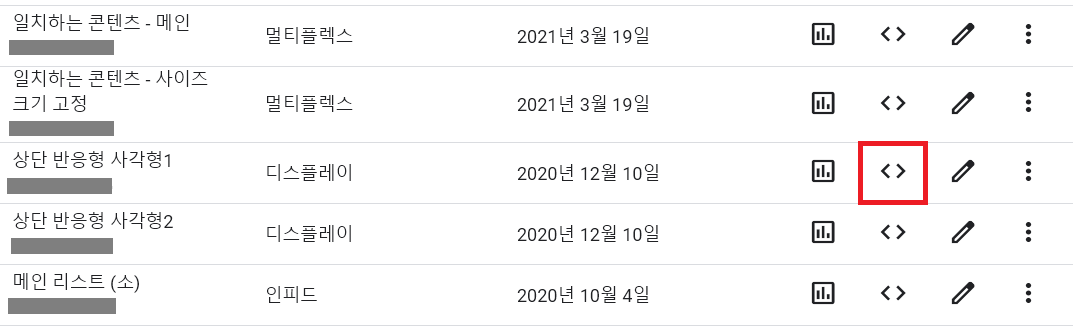 기존에 만들었던 광고 단위라면 다음 아이콘을 선택하여 확인할 수도 있습니다.
