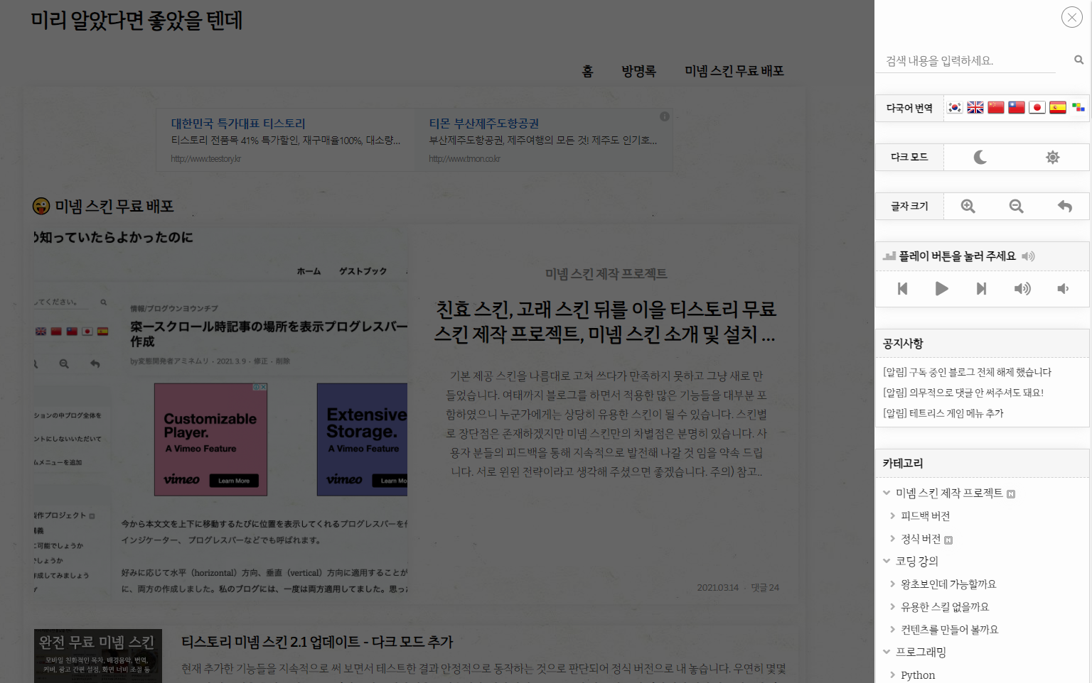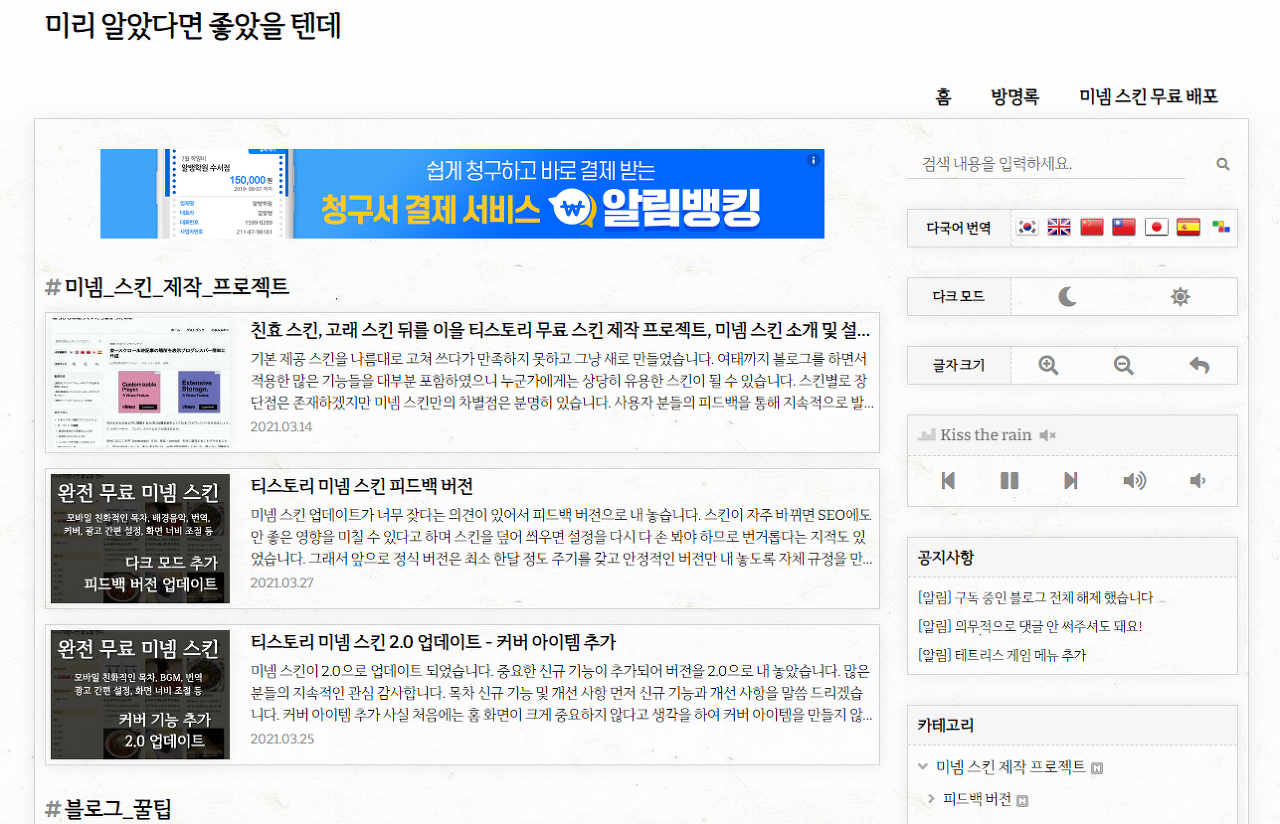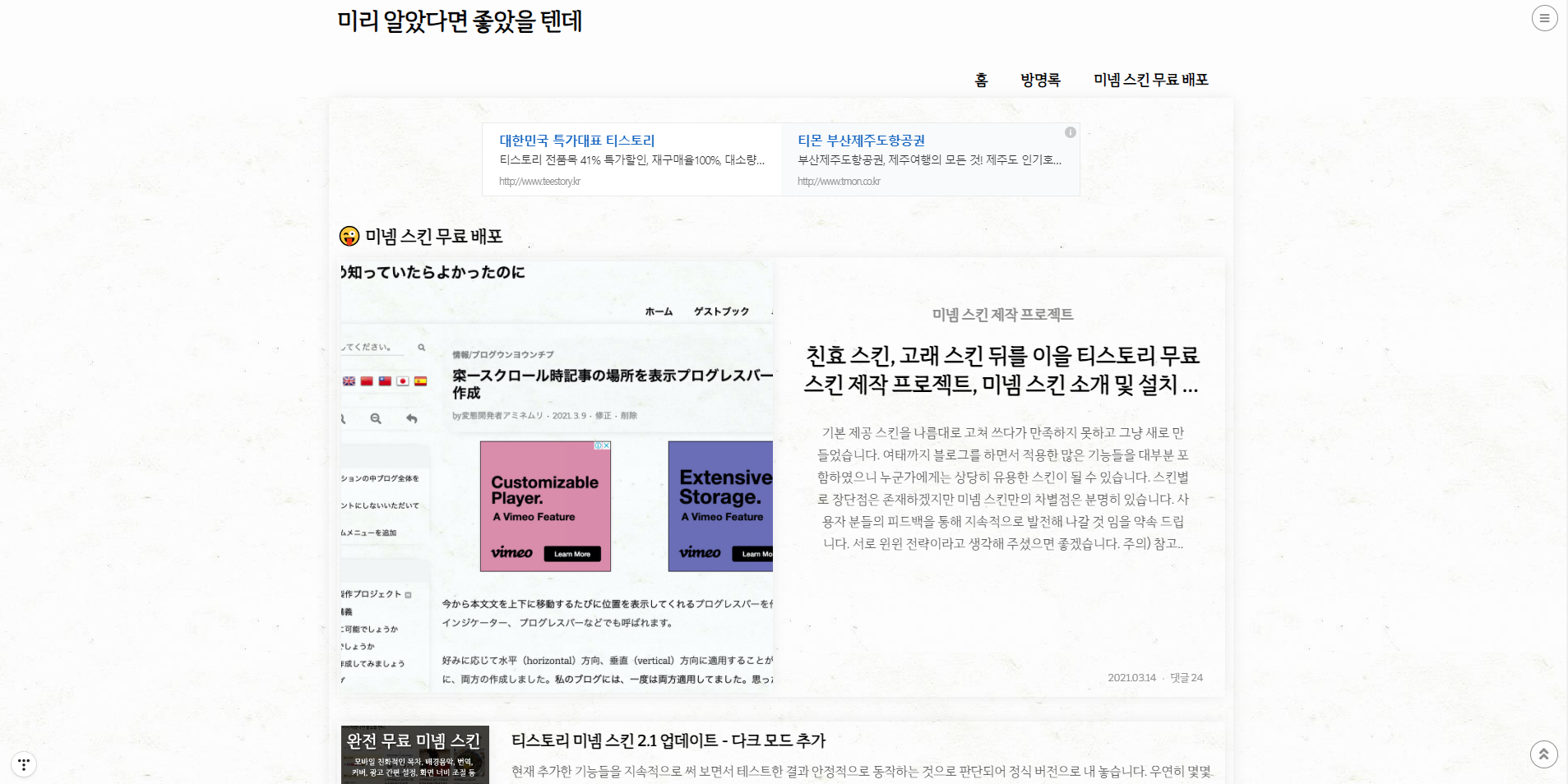 | 티스토리 무료 최강 미넴 스킨 소개 및 설치 방법 (491) | 2021.03.14 |
