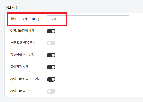 블로그 너비를 조정하면 사이드바의 크기도 같은 비율로 늘어나는 것이 그닥 좋아보이지 않아서 본문 영역만 너비가 커지고 사이드바는 300px로 고정하였습니다.