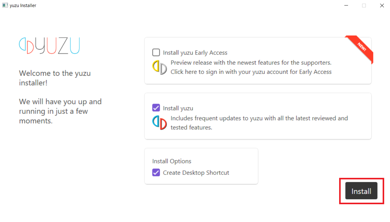 다른 목적이 없다면 기본 값으로 두고 Install 버튼을 클릭합니다. 참고로 yuzu Early Access 버전을 인스톨 하려면 후원을 해야 되는 것 같습니다. 저는 일단 패스 하겠습니다.