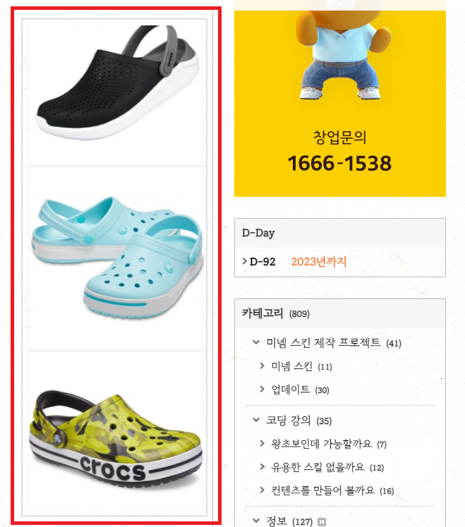 양 사이드의 빈 공간에 쿠팡 광고를 넣을 수 있는 기능입니다. 사이드바 멀티 플렉스 광고를 사용하지 않는 경우에만 적용되도록 하였습니다. 광고의 형태는 다음과 같습니다.