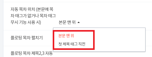 자동으로 생성되는 목차의 위치를 다음과 같이 본문 맨 위, 첫 제목 태그 직전 위치 중 선택할 수 있습니다. 이미 본문에 목차 태그가 있다면 입력된 목차가 적용됩니다. 입력한 목차를 무시하고 싶다면 '본문에 삽입 된 목차 태그 무시' 기능을 활용하시기 바랍니다. 다만 미넴 스킨에서 지원하지 않는 형태의 목차라면 정상적으로 동작하지 않을 수 있습니다.