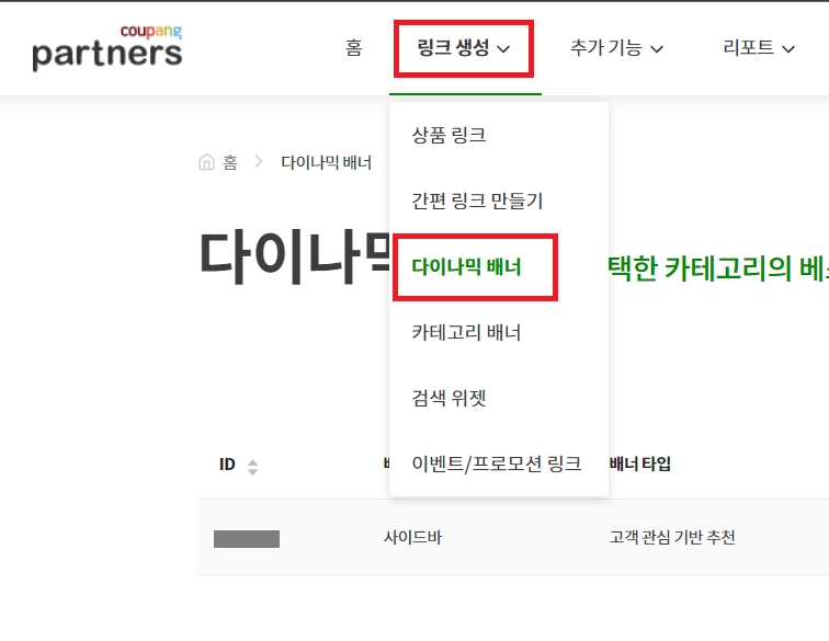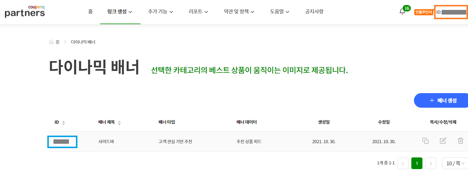쿠팡 파트너스 사이트에서 링크 생성 > 다이나믹 배너 생성 메뉴에서 ID를 생성할 수 있습니다.