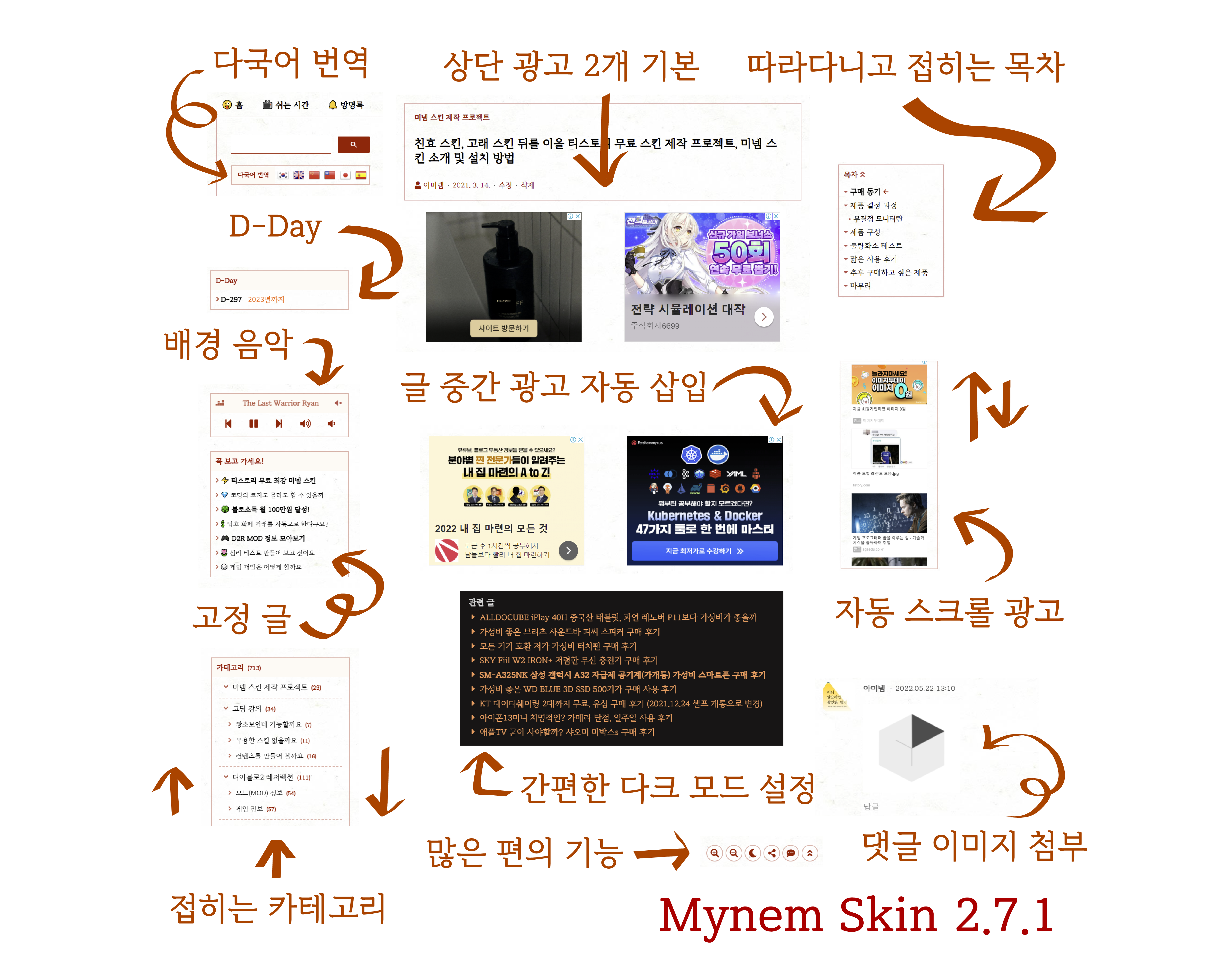 미넴 스킨 게시물에 대부분 설명이 나와 있지만 내용이 많아서 찾기 어렵거나 빨리 훑어 보고 싶으신 분들을 위해 작성하였습니다. 지속적으로 추가해 나가도록 하겠습니다. 목차 사이드바 기