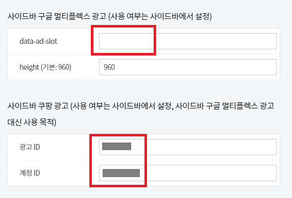다음과 같이 멀티플렉스 광고의 값은 빈 값으로 유지하고 쿠팡 광고 ID만 설정하면 됩니다. 둘 다 입력이 되어 있으면 멀티 플렉스 광고가 적용됩니다.